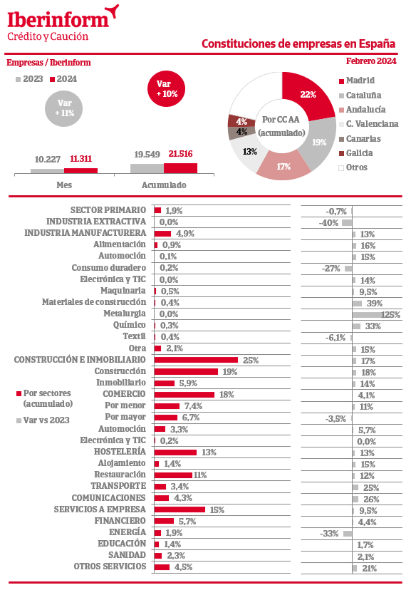 De acuerdo con el seguimiento de los registros mercantiles que realiza Iberinform, la constitución de nuevas empresas registró en febrero un aumento del 11% respecto al mismo mes del ejercicio anterior. En el conjunto del año la creación de tejido productivo acumula una subida del 10%. Las nuevas firmas se concentran en Madrid (22% del total), Cataluña (19%), Andalucía (17%) y la Comunidad Valenciana (13%). Por sectores de actividad, las constituciones se concentran en construcción e inmobiliario (25% del total), seguidas de comercio (18%), servicios a empresa (15%) y hostelería (13%).