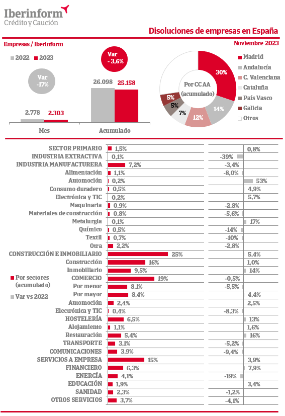 Los crecimientos más intensos de las disoluciones se registran en los sectores industria automotriz (un 53% más de cierres de empresas que entre enero y noviembre de 2022), metalurgia (17%), restauración (16%), inmobiliario (14%) y hostelería (13%). Las caídas más pronunciadas se registran en industria extractiva (-39%), energía (-19%), químico (-14%) e industria textil (-10%).