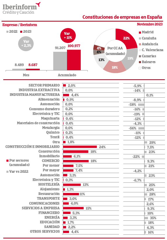 De acuerdo con el seguimiento de los registros mercantiles que realiza Iberinform, la constitución de nuevas empresas registró en noviembre un aumento del 2,3% respecto al mismo mes del ejercicio anterior. En el conjunto del año la creación de tejido productivo acumula una subida del 11%. Las nuevas firmas se concentran en Madrid (22% del total), Cataluña (19%), Andalucía (18%) y la Comunidad Valenciana (13%). Por sectores de actividad, las constituciones se concentran en construcción e inmobiliario (24% del total), seguidas de comercio (18%), servicios a empresa (15%) y hostelería (13%).