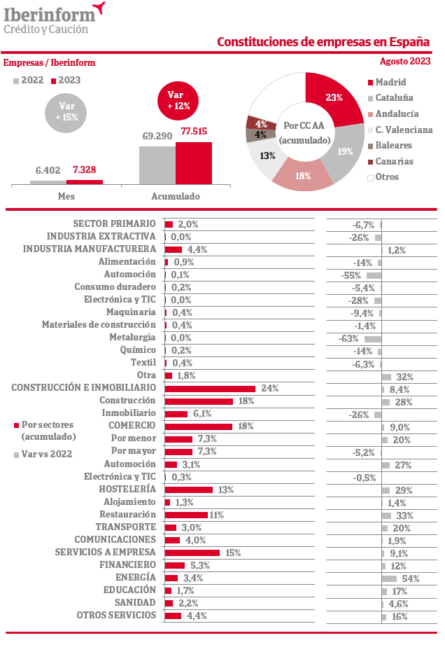 De acuerdo con el seguimiento de los registros mercantiles que realiza Iberinform, la constitución de nuevas empresas registró en agosto un aumento del 15% respecto al mismo mes del ejercicio anterior. En el conjunto del año la creación de tejido productivo acumula una subida del 12%. Las nuevas firmas se concentran en Madrid (23% del total), Cataluña (19%), Andalucía (18%) y la Comunidad Valenciana (13%). Por sectores de actividad, las constituciones se concentran en construcción e inmobiliario (24% del total), seguidas de comercio (18%), servicios a empresa (15%) y hostelería (13%).