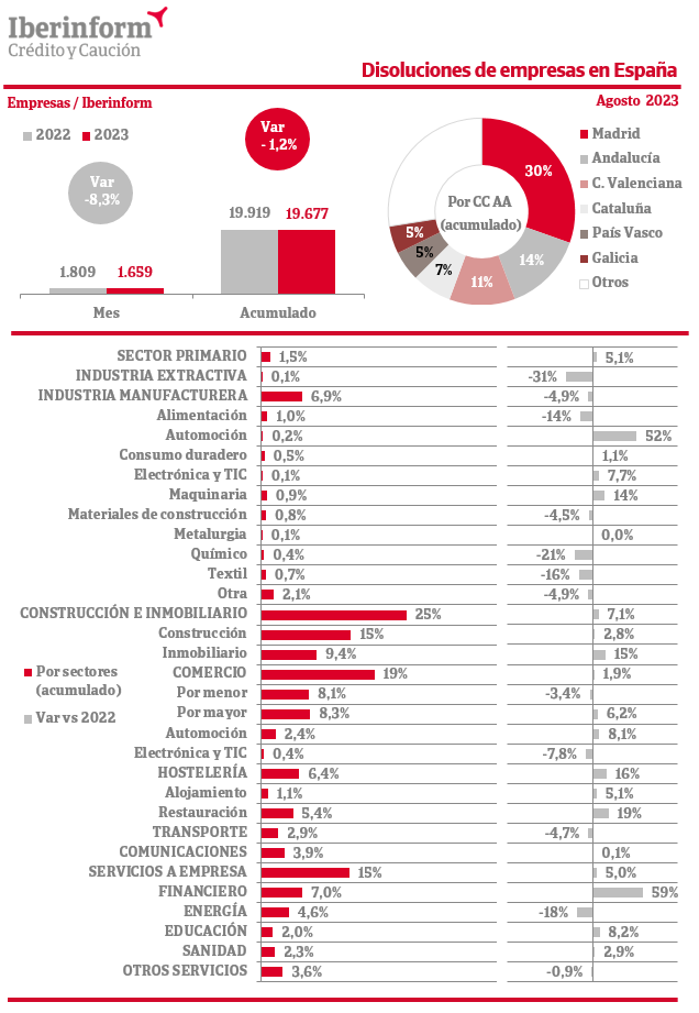 Los datos de agosto muestran que la disolución de empresas registró una disminución del -8,3% respecto al mismo mes del ejercicio anterior. En el conjunto del año acumula un decrecimiento del -1,2%. La destrucción de tejido empresarial se concentra en Madrid (30% del total), Andalucía (14%), la Comunidad Valenciana (11%) y Cataluña (7%). Por sectores de actividad, las disoluciones se concentran en construcción e inmobiliario (25% del total), seguidas del comercio (19%) y servicios a empresa (15%). Son menos intensas en los sectores de industria manufacturera (6,9%), hostelería (6,4%) y sector primario (1,5%).