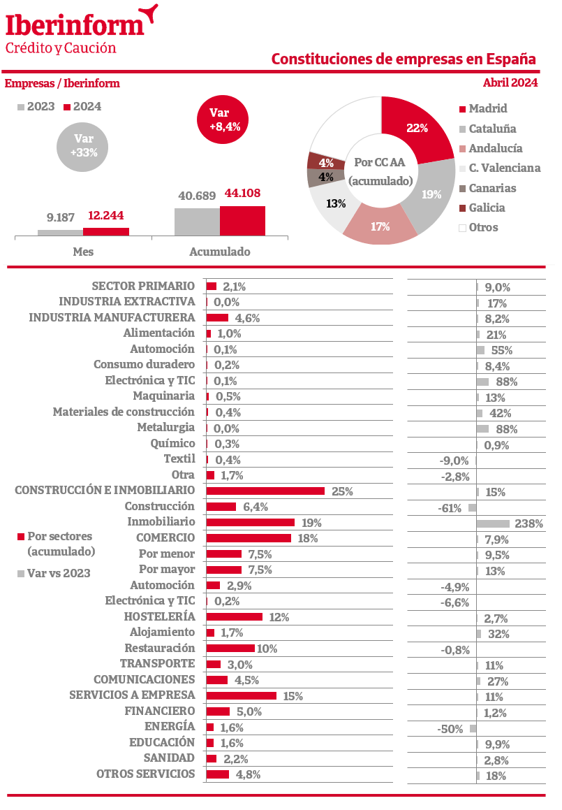De acuerdo con el seguimiento de los registros mercantiles que realiza Iberinform, la constitución de nuevas empresas registró en abril un aumento del 33% respecto al mismo mes del ejercicio anterior. En el conjunto del año la creación de tejido productivo acumula una subida del 8,4%. Las nuevas firmas se concentran en Madrid (22% del total), Cataluña (19%), Andalucía (17%) y la Comunidad Valenciana (13%). Por sectores de actividad, las constituciones se concentran en construcción e inmobiliario (25% del total), seguidas de comercio (18%), servicios a empresa (15%) y hostelería (12%).