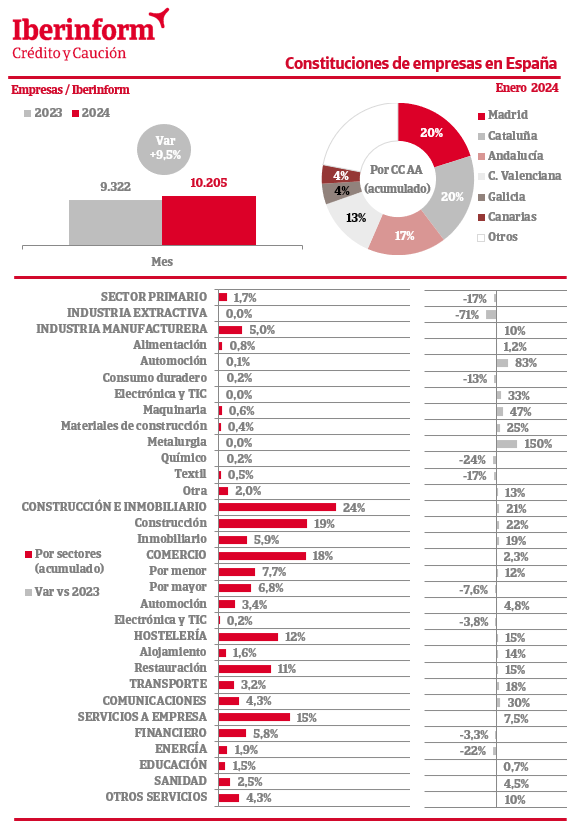 De acuerdo con el seguimiento de los registros mercantiles que realiza Iberinform, la constitución de nuevas empresas registró en enero un aumento del +9,5% respecto al mismo mes del ejercicio anterior. Las nuevas firmas se concentran en Madrid (20% del total), Cataluña (20%), Andalucía (17%) y la Comunidad Valenciana (13%). Por sectores de actividad, las constituciones se concentran en construcción e inmobiliario (24% del total), seguidas de comercio (18%), servicios a empresa (15%) y hostelería (12%).