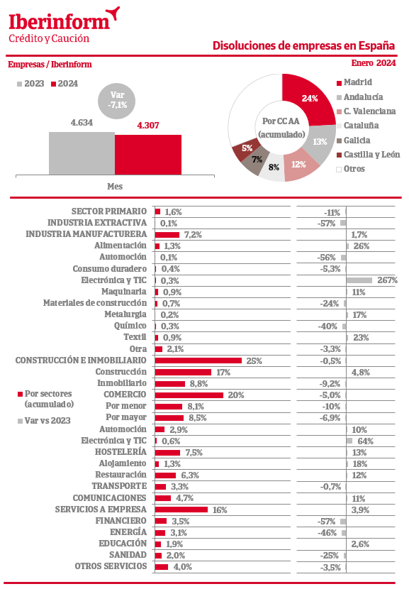 Los datos de enero muestran que la disolución de empresas registró una disminución del -7,1% respecto al mismo mes del ejercicio anterior. La destrucción de tejido empresarial se concentra en Madrid (24% del total), Andalucía (13%), la Comunidad Valenciana (12%) y Cataluña (8%). Por sectores de actividad, las disoluciones se concentran en construcción e inmobiliario (25% del total), seguidas del comercio (20%) y servicios a empresa (16%). Son menos intensas en los sectores de hostelería (7,5%), industria manufacturera (7,2%) y sector primario (1,6%).