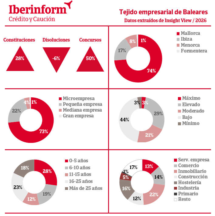 El tejido productivo de Baleares ha estabilizado sus niveles de riesgo de crédito en los últimos dos años. El 32% de las empresas de la región presenta un riesgo elevado o máximo de impago. El indicador, similar al de 2025, se encuentra muy por encima del 14% que registraba antes de la pandemia. Ese es uno de los datos más relevantes que ofrece la radiografía del tejido productivo del archipiélago elaborada con la solución de analítica avanzada Insight View. La creación de empresas muestra un aumento de 28%, mientras las disoluciones caen un -6%. Preocupa el repunte de los procesos concursales, que se han elevado un 50% respecto al año pasado.