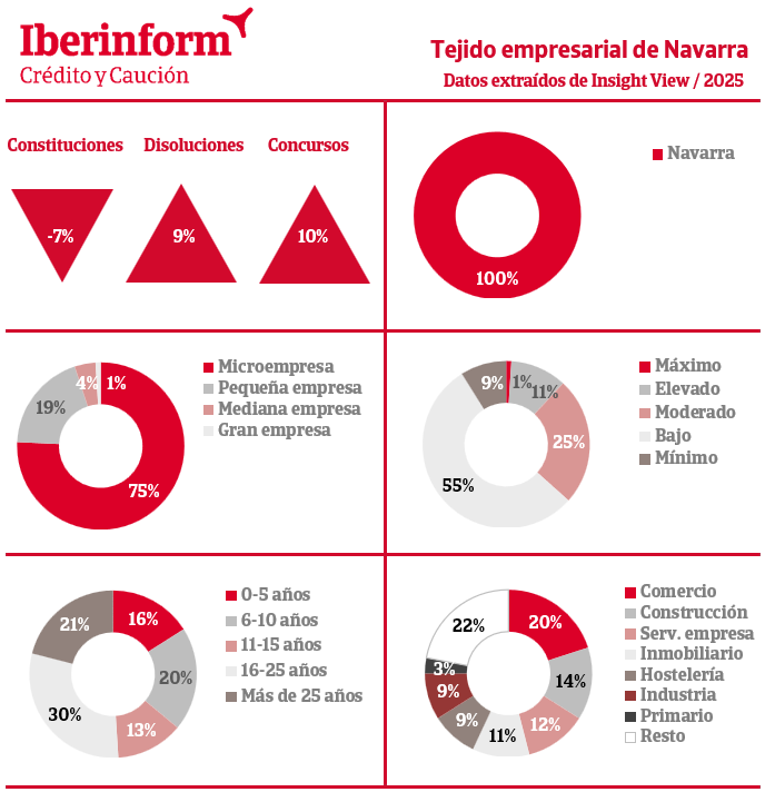 El tejido productivo de Navarra mantiene estable sus niveles de riesgo de crédito en 2025. Solo el 12% de las empresas de la región presenta un riesgo máximo o elevado de impago, según los datos recopilados a través de la solución de analítica avanzada Insight View. No obstante, los niveles de empresas en riesgo se encuentran todavía cuatro puntos por encima de los valores anteriores a la pandemia. En los once primeros meses de 2025, la Comunidad Foral de Navarra registra un descenso interanual del 7% en la creación de nuevas empresas mientras que la destrucción se ha incrementado un 9% y los concursos de acreedores un 10%.
