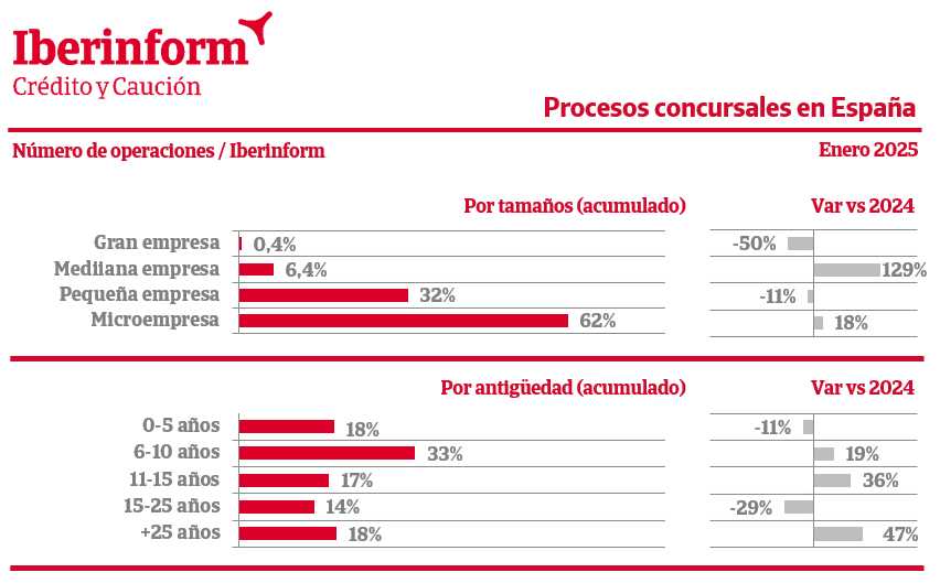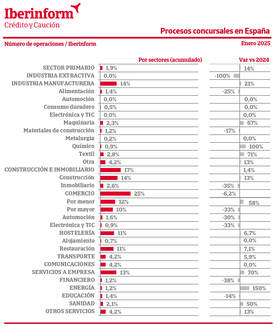 Por sectores, en enero de 2025 predominan las insolvencias en el comercio (25% del total) y en los sectores de construcción e inmobiliario (17%), seguidos de la industria manufacturera (14%), servicios a empresa (13%) y hostelería (11%). Los mayores incrementos se registran en los subsectores de energía (150%), químico (100%), textil (71%), servicios a empresa (70%), maquinaria (67%), comercio al por menor (58%) y sanidad (50%). La concursalidad registra mejorías en los subsectores de industria extractiva (-100%), financiero (-38%), inmobiliario (-35%), comercio al por mayor y electrónica y TIC (-33%) y automoción (-30%).