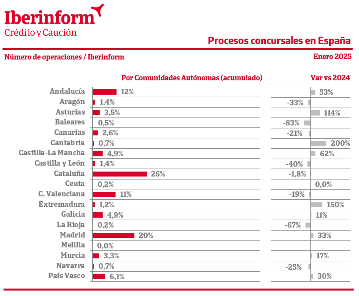 La concursalidad empresarial se concentra en Cataluña (26% del total), Madrid (20%), Andalucía (12%) y la Comunidad Valenciana (11%). Los mayores crecimientos en enero de 2025 se han registrado en Cantabria (200%), Extremadura (150%), Asturias (114%), Castilla La Mancha (62%) y Andalucía (53%). Por el contrario, Baleares (-83%), La Rioja (-67%), Castilla y León (-40%), Aragón (-33%), Navarra (-25%), Canarias (-21%), C. Valenciana (-19%) y Cataluña (-1,8%) registran una mejoría de los niveles de concursalidad.
