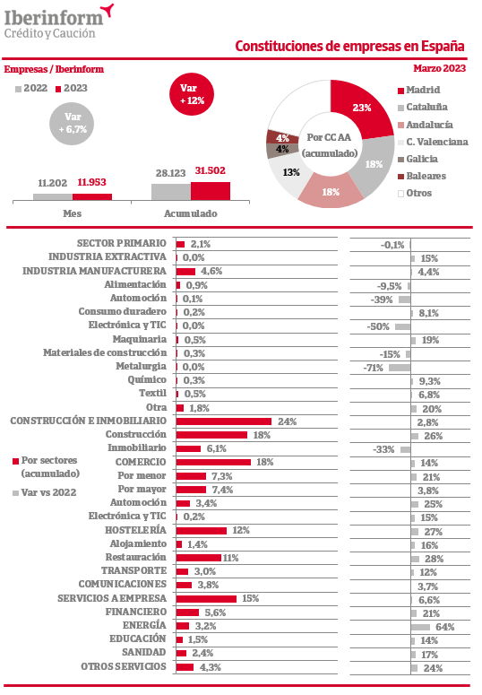 En marzo la constitución de empresas registró un aumento del 6,7% respecto al mismo periodo del ejercicio anterior. En el conjunto del año la creación de tejido productivo acumula una subida del 12%. Las nuevas firmas se concentran en Madrid (23% del total), Cataluña (18%), Andalucía (18%) y la Comunidad Valenciana (13%). Por sectores de actividad, predominan las constituciones en construcción e inmobiliario (24% del total), seguidas de comercio (18%), y servicios a empresa (15%). Son menos intensas en los sectores de hostelería (12%), industria manufacturera (4,6%) y sector primario (2,1%).