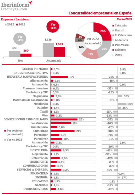 Cataluña (25% del total) y Madrid (20%) son las Comunidades Autónomas donde más concursos se declaran. Les siguen la Comunidad Valenciana (17%) y Andalucía (12%). Por sectores, predominan las insolvencias en construcción e inmobiliario (23% del total) y el comercio (21%), seguidos de la industria manufacturera (15%), hostelería (9,3%) y servicios a empresa (9,2%).