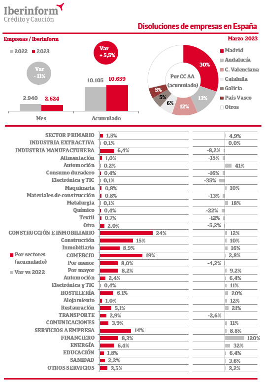 En marzo la disolución de empresas registró un decrecimiento del -11% respecto al mismo periodo del ejercicio anterior. En el conjunto del año acumula un incremento del 5,5%. La destrucción de tejido empresarial se concentra en Madrid (30% del total), Andalucía (13%), la Comunidad Valenciana (12%) y Cataluña (6%). Por sectores de actividad, predominan las disoluciones en construcción e inmobiliario (24% del total), seguidas del comercio (19%) y servicios a empresa (14%). Son menos intensas en los sectores de industria manufacturera (6,4%), hostelería (6,1%) y el sector primario (1,5%).