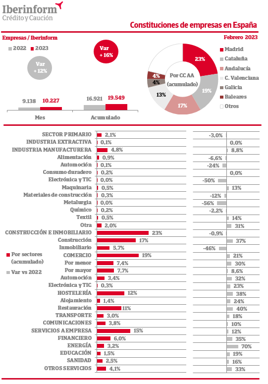 En febrero la constitución de empresas registró un aumento del 12% respecto al mismo periodo del ejercicio anterior. En el conjunto del año la creación de tejido productivo acumula una subida del 16%. Las nuevas firmas se concentran en Madrid (23% del total), Cataluña (19%), Andalucía (17%) y la Comunidad Valenciana (13%). Por sectores de actividad, predominan las constituciones en construcción e inmobiliario (23% del total), seguidas de comercio (19%), y servicios a empresa (15%). Son menos intensas en los sectores de hostelería (12%), industria manufacturera (4,8%) y sector primario (2,1%).