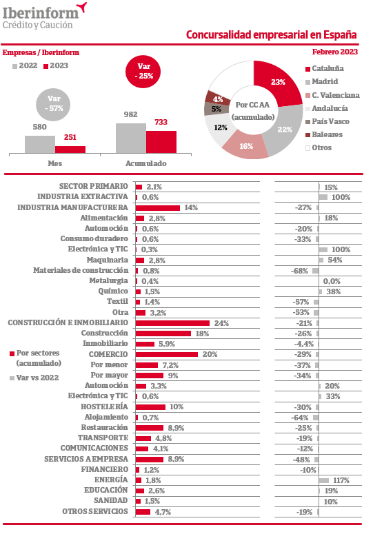 Cataluña (23% del total) y Madrid (22%) son las Comunidades Autónomas donde más concursos se declaran. Les siguen la Comunidad Valenciana (16%) y Andalucía (12%). Por sectores, predominan las insolvencias en construcción e inmobiliario (24% del total) y el comercio (20%), seguidos de la industria manufacturera (14%), hostelería (10%) y servicios a empresa (8,9%).