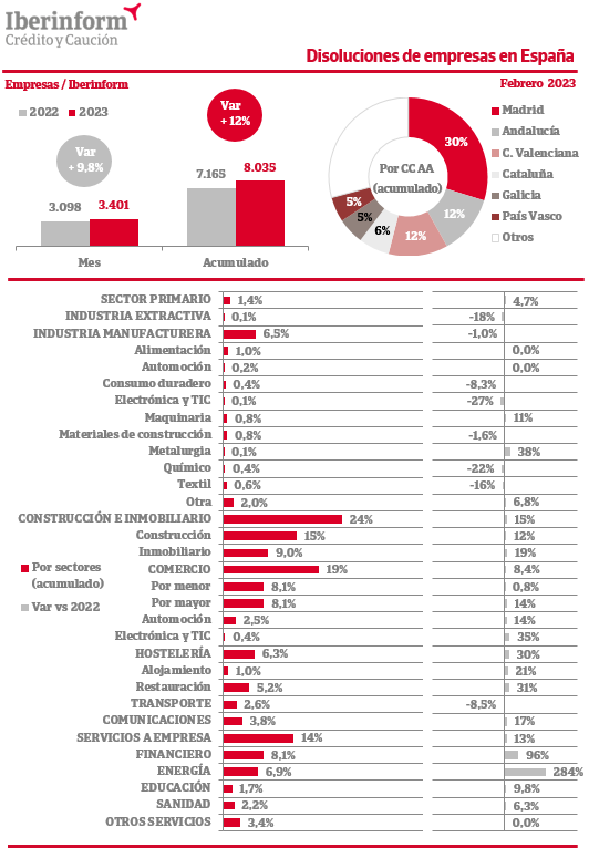 En febrero la disolución de empresas registró un crecimiento del 9,8% respecto al mismo periodo del ejercicio anterior. En el conjunto del año acumula un incremento del 12%. La destrucción de tejido empresarial se concentra en Madrid (30% del total), Andalucía (12%), la Comunidad Valenciana (12%) y Cataluña (6%). Por sectores de actividad, predominan las disoluciones en construcción e inmobiliario (24% del total), seguidas del comercio (19%) y servicios a empresa (14%). Son menos intensas en los sectores de industria manufacturera (6,5%), hostelería (6,3%) y el sector primario (1,4%).