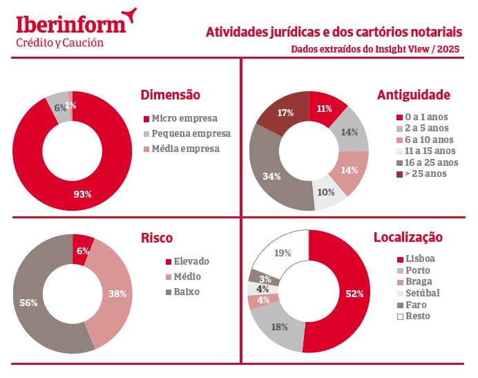 As empresas de atividades jurídicas e cartórios notariais são representadas, em 93%, por microempresas, uma larga maioria, existindo, ainda, 6% de pequenas empresas e 1% de médias empresas. Na distribuição do volume de negócios por dimensão de empresa, verificamos que a maior fatia pertence às microempresas (36%), seguido de muito perto pelas empresas médias (35%). A restante percentagem, de 29%, é então, registada pelas pequenas empresas. Neste setor, é possível observar a grande importância das micro e pequenas empresas no volume total de faturação que, em conjunto, é superior a dois terços.