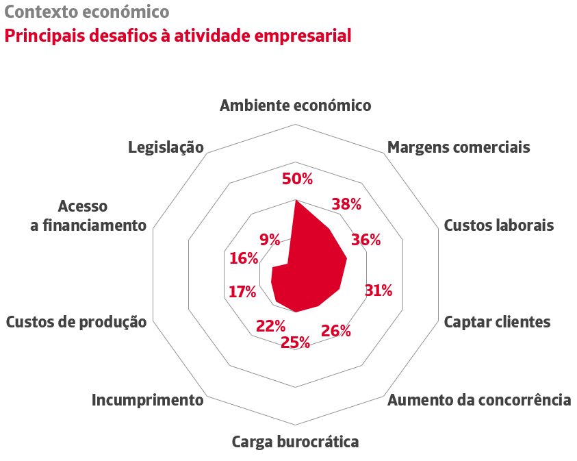 A evolução incerta do ambiente económico é a principal preocupação das empresas portuguesas para 2025. De acordo com a vaga de outono do Estudo de Gestão do Risco de Crédito em Portugal, promovido pela Crédito y Caución e Iberinform, 50% do tecido produtivo nacional aponta o contexto geral, marcado pelo baixo crescimento, entre os principais desafios para os negócios. Outros fatores mencionados estão estreitamente ligados a este contexto geral: margens comerciais insuficientes (38% das empresas), custos laborais excessivos (36%), dificuldades na captação de clientes (31%) ou aumento da concorrência (26%). As empresas apontam, ainda, a carga burocrática (25%), os atrasos de pagamento (22%), os custos de produção (17%), o acesso ao financiamento (16%) e o enquadramento legislativo (9%), como desafios para a sua atividade.