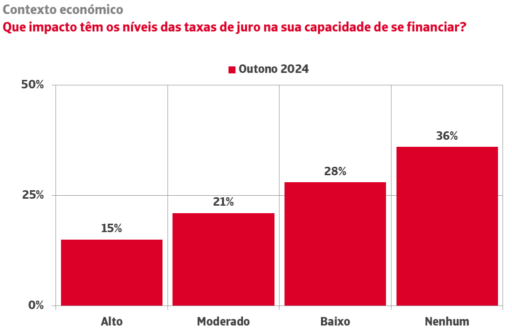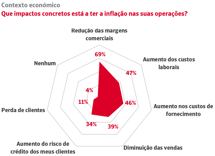 O impacto da inflação e dos níveis das taxas de juro moderou-se em 2024, em linha com a moderação da evolução dos preços e a maior flexibilidade da política monetária. Contudo, 96% das empresas confirmem algum tipo de impacto da inflação nas suas operações. Os principais impactos ocorrem na estrutura de custos, o que pode afetar a capacidade de muitas empresas para operar de forma lucrativa; 47% das empresas estão a sentir incrementos nos seus custos laborais e 46% indicam aumentos nos custos de aquisição.