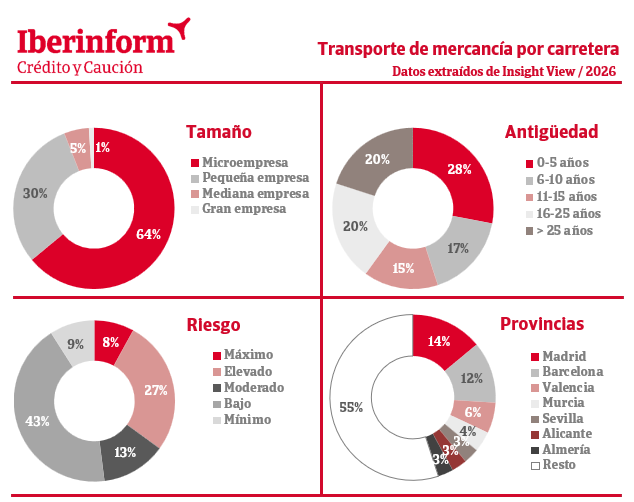 Los elevados niveles de riesgo de crédito del sector están muy vinculados a su atomización. Apenas un 6% del tejido está compuesto por grandes y medianas empresas. El 30% está formado por pequeñas empresas y la dimensión del 64% es de microempresa. El análisis de la antigüedad empresarial habla de la alta rotación: el 45% de las compañías de transporte de mercancías por carretera ha sido fundada en la última década, lo que supone un porcentaje muy elevado en comparación con otras actividades productivas.