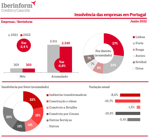 As insolvências registam uma diminuição de 2,4% em junho face ao mesmo período do ano passado. O acumulado do ano totaliza 2.340 insolvências, menos 171 que no primeiro semestre de 2021 (-6,8%).