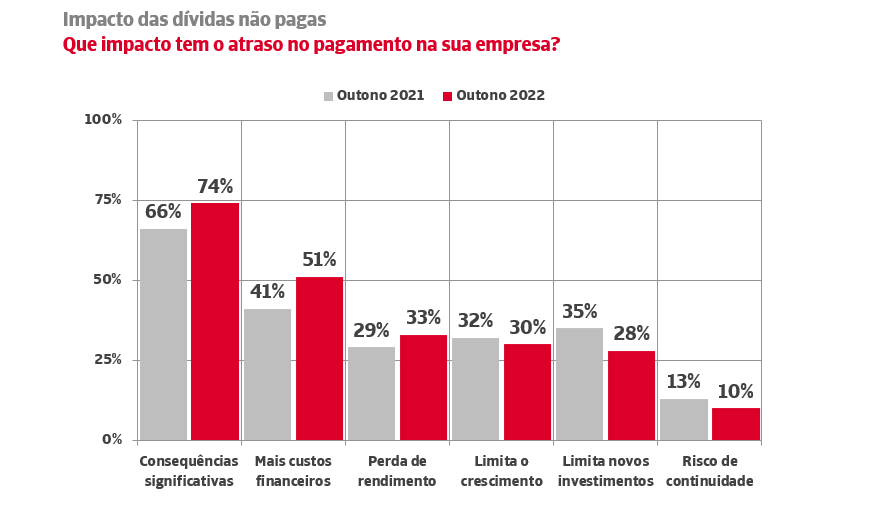 De acordo com o Estudo de Gestão de Risco de Crédito em Portugal, 33% das empresas portuguesas enfrentam perdas de receitas significativas por causa da morosidade, mais quatro pontos percentuais que há um ano. O agravamento dos efeitos da morosidade alcança níveis superiores nos aspetos da atividade empresarial afetados pelo agravamento das taxas de juro: 51% do tecido empresarial regista um aumento dos seus custos de financiamento (dez pontos mais que em 2021). A expansão comercial é travada por 30% das empresas (dois pontos menos que há um ano) e 28% vê-se obrigado a limitar os seus novos investimentos (sete pontos menos).