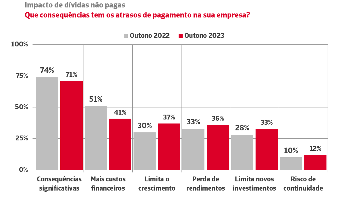 De acordo com o Estudo de Gestão de Risco de Crédito em Portugal, 36% das empresas portuguesas enfrentam perdas de receitas significativas por causa da morosidade. O agravamento dos efeitos da morosidade alcança níveis superiores nos aspetos da atividade empresarial afetados pelo agravamento das taxas de juro: 41% do tecido empresarial regista um aumento dos seus custos de financiamento. A expansão comercial é travada por 37% das empresas e 33% veem-se obrigadas a limitar os seus novos investimentos.