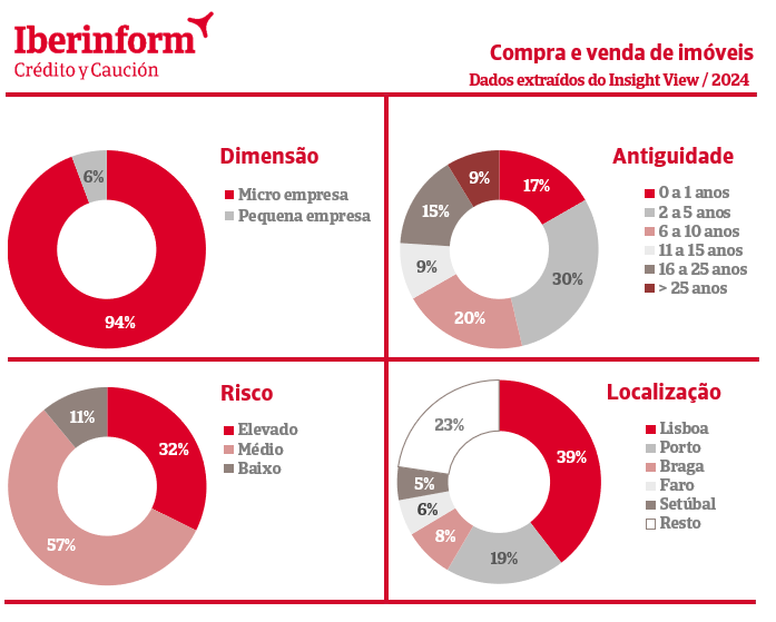 Contudo, segundo os dados do Insight View, o setor de compra e venda de imóveis apresenta um elevado risco para 32% das empresas portuguesas, enquanto 57% enfrentam um risco considerado médio e apenas 11% desfrutam de uma situação de baixo risco. Apesar destes desafios, o tecido empresarial é dominado por microempresas, representando cerca de 94% do total, enquanto as pequenas empresas compõem cerca de 6%, e as médias e grandes empresas representam menos de 1%.