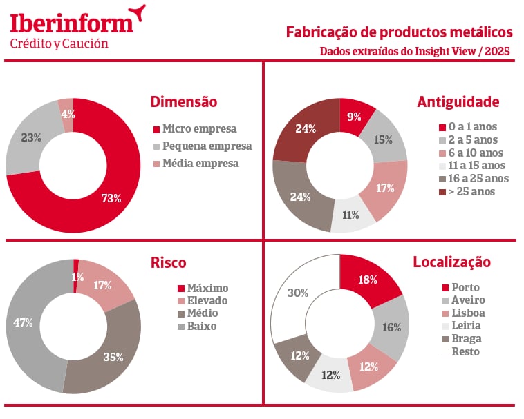 Quanto à antiguidade das empresas, vemos que 48%, quase metade, das empresas de produtos metálicos foram constituídas há mais de 15 anos, enquanto 24% têm menos de cinco anos. A antiguidade é um fator relevante no risco de crédito que, segundo os dados do Insight View, é notório que as empresas com menos de cinco anos possuem um nível de risco elevado, sendo o risco das empresas com mais de 15 anos classificado como médio, a aproximar-se do baixo.